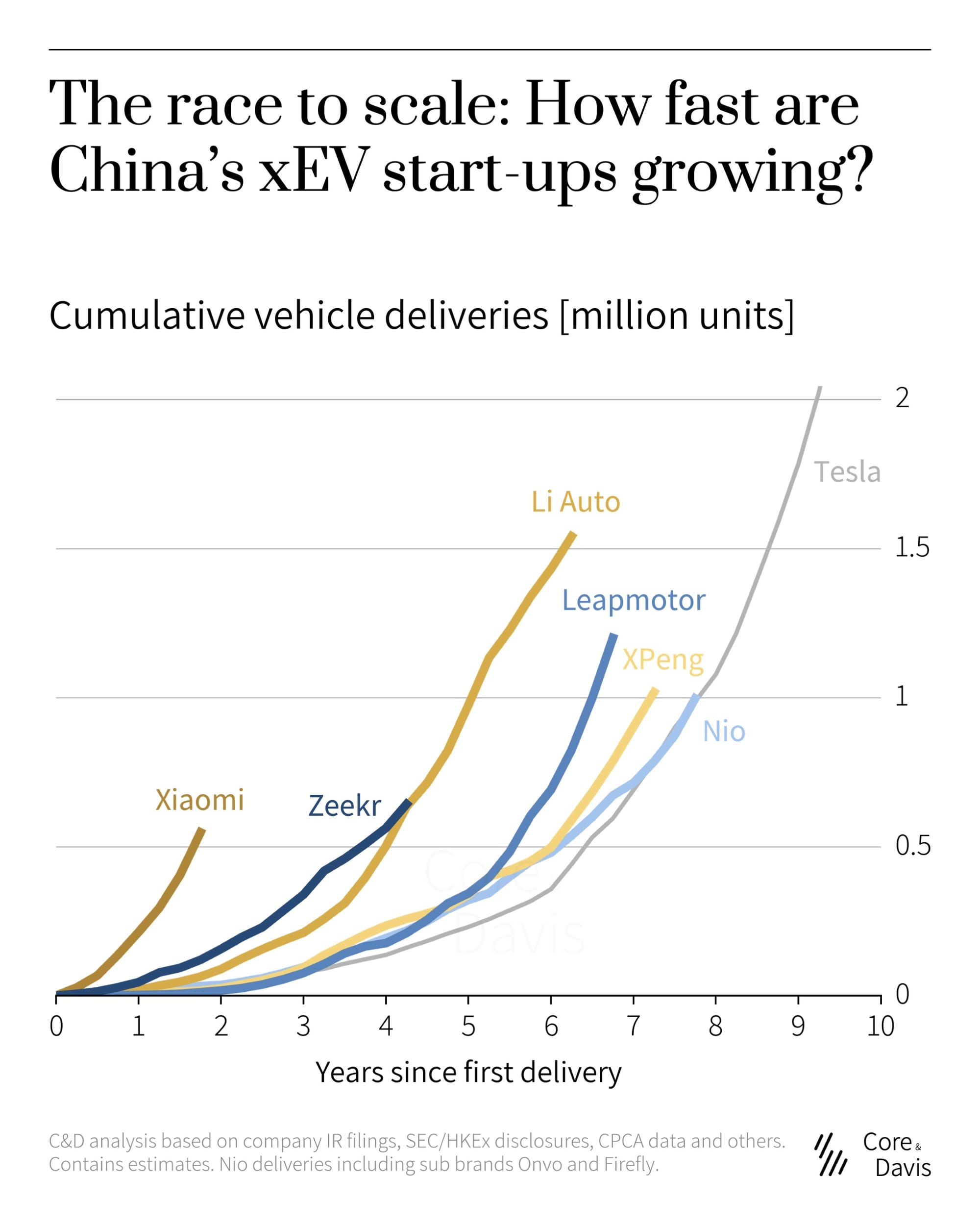 This chart compares cumulative deliveries of Nio, XPeng, Li Auto, Leapmotor, Zeekr and Xiaomi since each brand’s first vehicle delivery - with Tesla as reference.